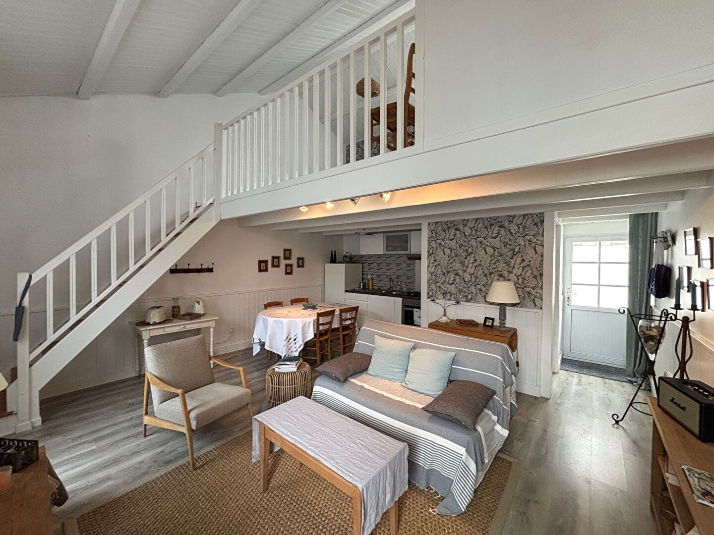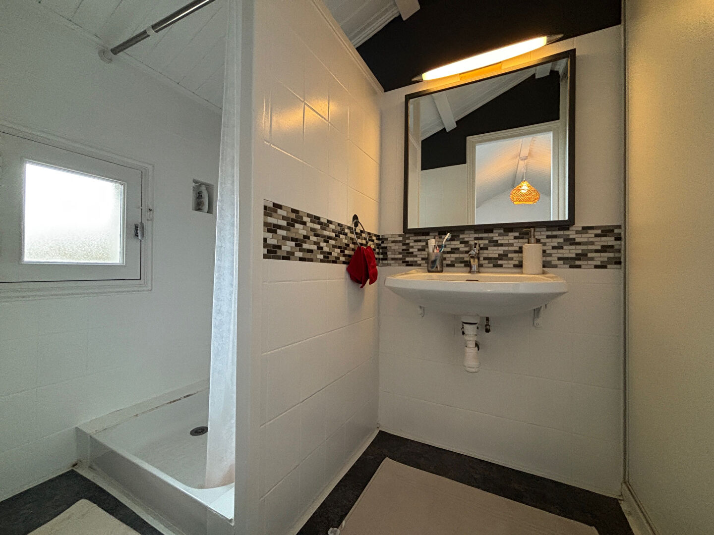 A l'étage, une mezzanine accueille une chambre cosy avec velux, une salle d'eau moderne ainsi qu'un espace placard optimisé.