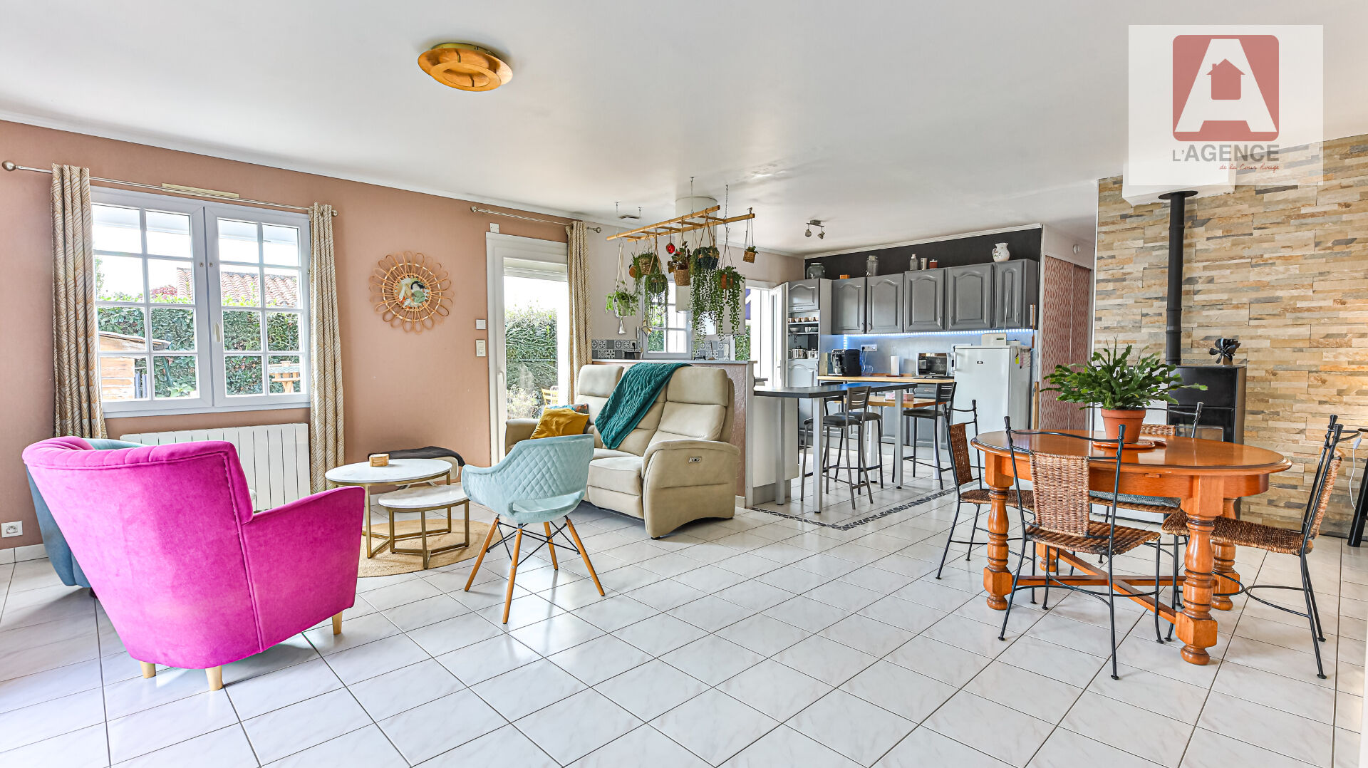 - Pièce de vie lumineuse avec poêle