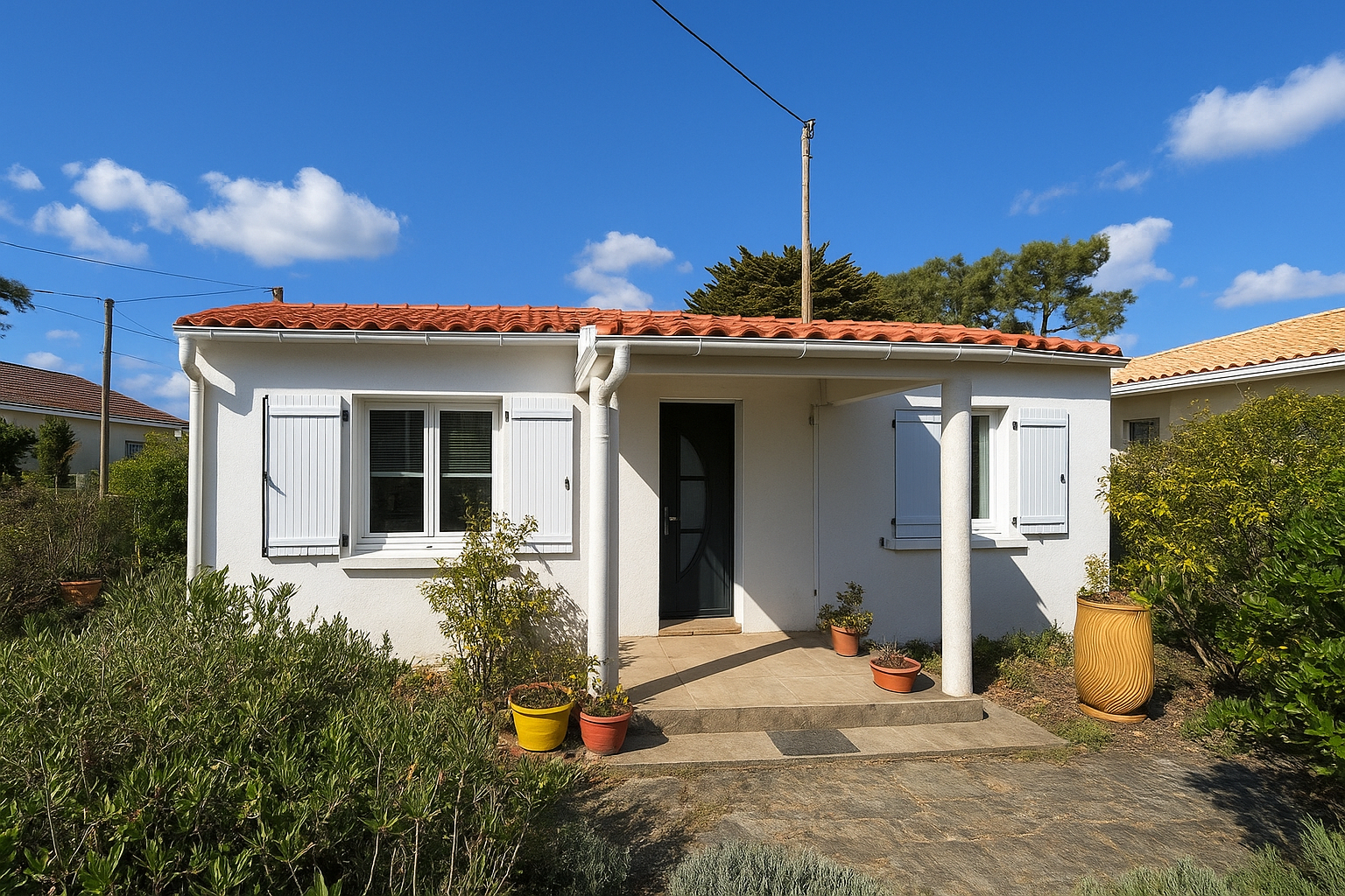 A vendre charmante maison de 55m² idéalement située dans une impasse calme, à seulement 750 mètres de la plage de Boisvinet.