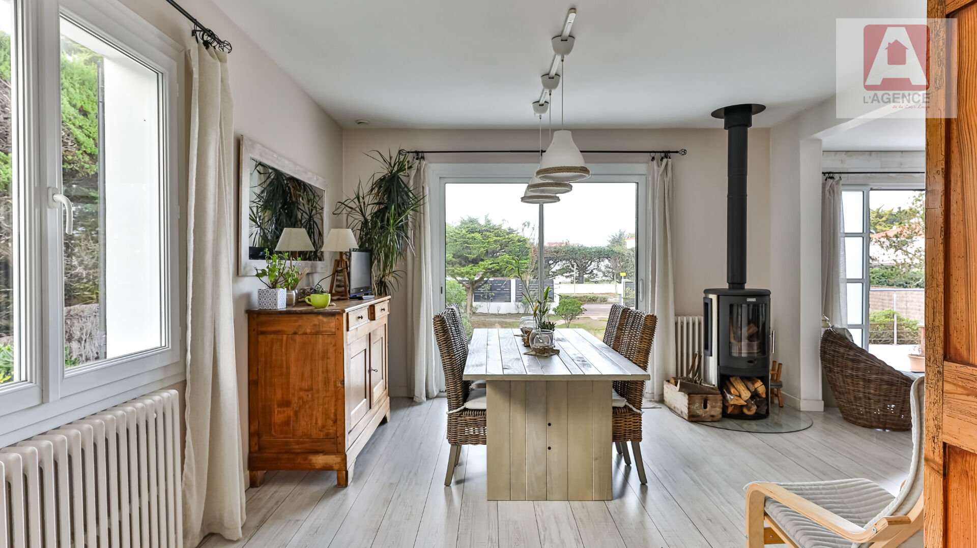 Elle se compose d'un salon séjour baigné de lumière avec un poêle à bois, une cuisine aménagée et équipée, 3 chambres dont une suite parentale avec un dressing et une salle de bain, une salle d'eau, un deuxième salon, un wc, un cellier et un garage.